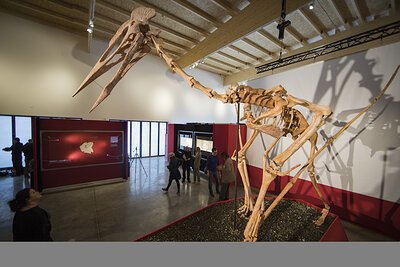 Weitere Highlights sind in der Museumshalle zu sehen. Neben original Fossilien wird das echte Skelett des T. rex „Rocky“ ausgestellt. „Rocky“ ist eine Besonderheit unter den Dinosauriern. Denn er ist der erste jemals gefundene Tyrannosaurus rex im Teenager-Alter, mit einem ungewöhnlich gut erhaltenen Skelett. Es bietet uns Erkenntnisse über die Lebensweise der Urzeitgiganten gegen Ende der Kreidezeit vor 66 Millionen Jahren. In seiner kurzen Lebenszeit hat er schon so einiges überstanden, wie furchterregende Bissspuren in seinem Skelett belegen. Eine weitere Sensation ist „Dracula“, der größte und schwerste Flugsaurier, der jemals gefunden wurde. Stehend war er so groß wie eine Giraffe und seine Flügelspannweite betrug mindestens 12 Meter. Außerdem ist im Dinosaurier Museum nicht nur der erdgeschichtlich älteste Urvogel Archaeopteryx zu sehen, sondern auch das erdgeschichtlich jüngste Exemplar, der Archaeopteryx albersdoerferi.
